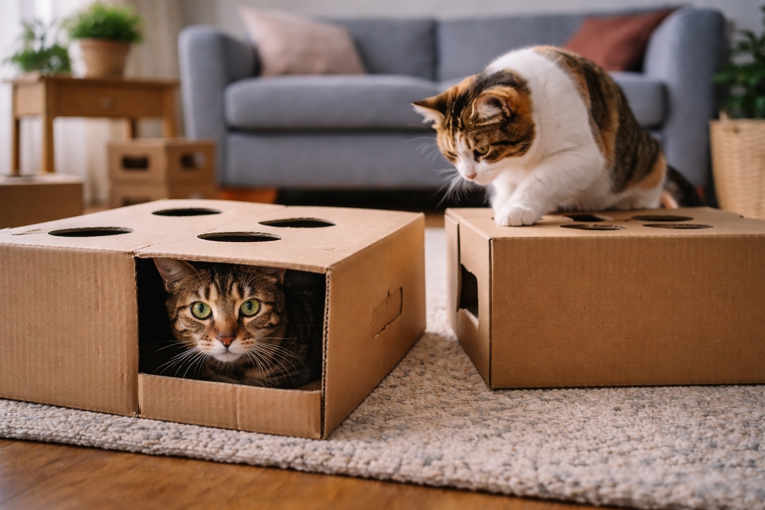 Riutilizzare scatole e cartone per creare giochi non è solo economico: è arricchimento ambientale puro, fatto su misura per la mente del gatto.